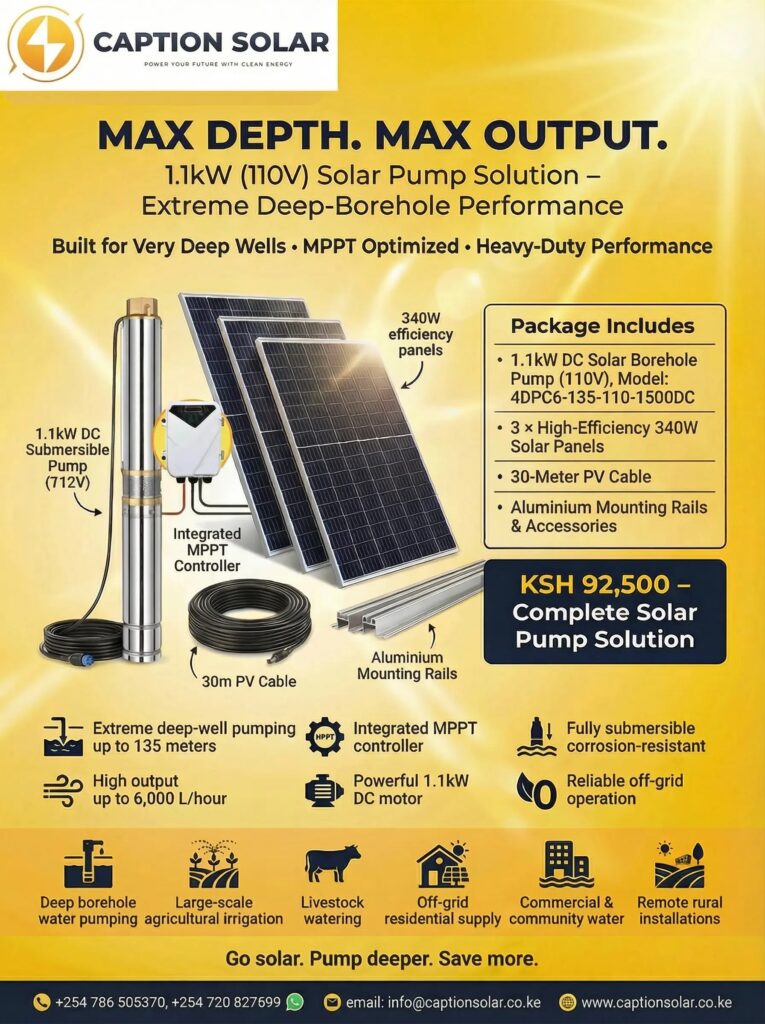 The 1.1kW (110V) Solar Pump Solution is a heavy-duty, high-head solar water pumping system engineered for very deep boreholes…